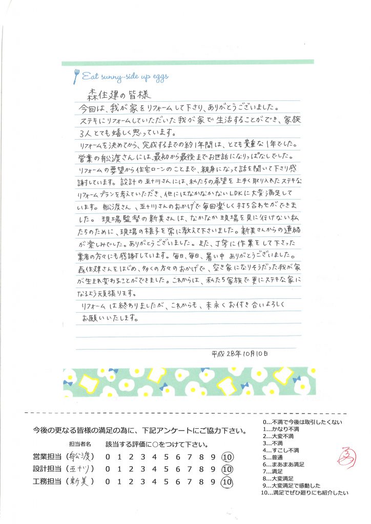 今回は我が家をリフォームして下さり、ありがとうございました。
