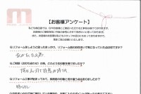 家が古くなり、内装・水廻りが傷んできて、そろそろリフォームしないといけないかな?と思い、いろいろと施工会社を探してました。その中の一社が森住建さんでした。他のメーカーと違い、最初から丁寧にお話を聞いてもらえ、予算内での私の考えているリフォームに近いものを提案して頂けました。