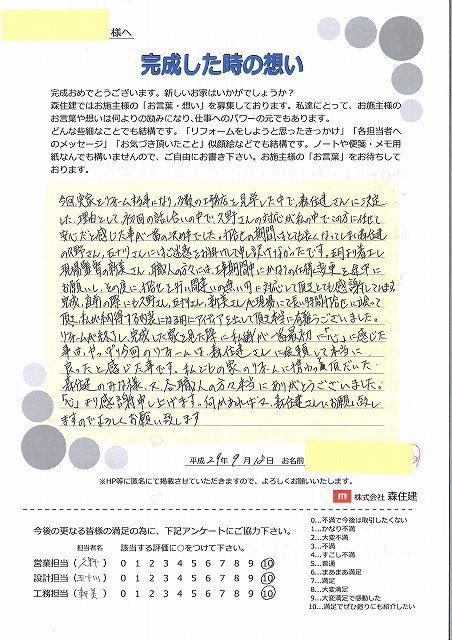 リフォームが終了し、完成した家を見た際に私自身が一番最初に「心」を感じた事は、やっぱり今回のリフォームは、森住建さんに依頼して本当に良かったと感じた事です。私どもの家のリフォームに携わって頂いた森住建のみな様、又、各職人の方々本当にありがとうございました。