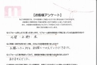 築49年の我が家は、外壁や水廻りや床に傷みが目立つようになり、どこの業者にお願いしようかと迷っていた時、偶然桜田さんが「何かお困りの事はありませんか」と訪ねて来られ、会社の事を色々伺って、信用出来る会社だと思えたので、お願いする事にしました。そして村上さんと出会いました。修理してほしい所を伝えると、すぐに工程表を組んで下さったのです。毎日のように来て下さり、進み具合を確かめ、職人さんと話し合い、指示する姿は頼もしく、安心してお任せしておりました。その上で、ここに棚がほしい。ここには扉を付けてほしい。ここにコンセントを・・・など、こちらの希望をきっちり実現して下さったのです。又、次々に来て下さる職人さんが、とても丁寧な仕事をして下さり、森住建さんは、本当に良い職人さん達と組んで仕事をしてみえるなと思いました。帰りには皆さんきれいに掃除をして帰られ、気配りがとてもうれしかったです。