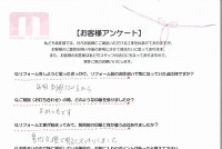 途中で担当が若い人に変わったのには若干不満はありましたが、新しい方もとても親切で細やか配慮で良くやっていただき感謝しております。業者の方も、地元の方で感じ良く、仕上がりはほぼ満足しております。そのような訳で感謝しておりますが、恐縮ながら敢えて正直に述べさせて頂きますと、種々の担当業者が入れ替り仕事を行う現場であるので、もう少し現場に来ていただけたらと思いました。それから工事完了後、その後何も音信が無くなってしまったのは残念に思います。