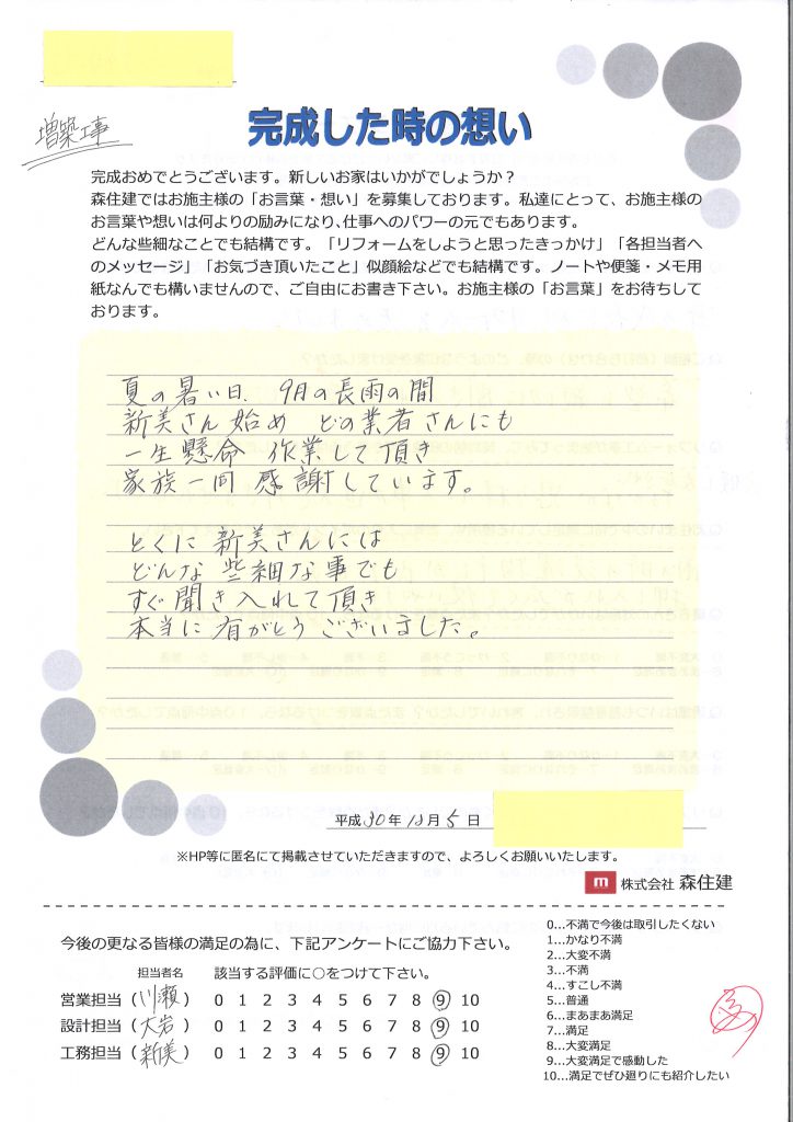 夏の暑い日、9月の長雨の間 新美さん始め どの業者さんにも 一生懸命作業して頂き 家族一同感謝しています。 とくに新美さんには どんな些細な事でも すぐ聞き入れて頂き 本当に有がとうございました。