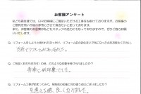 打ち合わせはキッチンのレイアウトと勝手口ドアの相談で二転三転途中からお風呂と洗面所も追加となり、設備メーカーのショールームも含めると平田さんには24回も丁寧に要望を聞いてもらって大変お世話になりました。床の修理が最優先の要望どおり大工仕事もしっかり丁寧に作業して頂いて大変満足です。