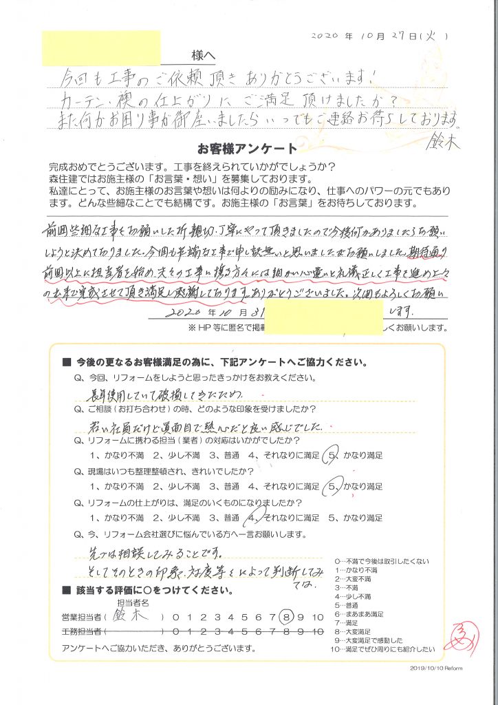 期待通り前回以上に担当者を始め、其々の工事に携わる方々には細かい心遣いと礼儀正しく工事を進め上々の出来で完成させて頂き満足し感謝しております。ありがとうございました。次回もよろしくお願いします。