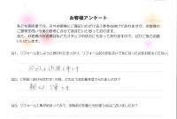 こちらのいくつかの要望に対して、すべて的確にご返答を下さいました。また今回の工事だけではなく、その先にあるメリット、デメリットもしっかりご説明を下さいました。私共も納得が出来、最善の(私共が望む)工事をしていただきました。近隣の方への配慮も充分にして下さり、私共も安心してお願いが出来、とても感謝致しております。今後も長いおつきあいをよろしくお願い致します。
