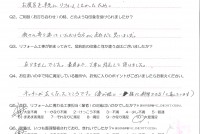 コロナ禍という事もあり、工期が遅れたり部品が遅れたりなど色々ありましたが、都度”最善”の対応をしていただいたと思っております。物品の販売と違い、家屋は、リフォーム後も御社にお頼みする事があるかもしれません。今後ともどうかよろしくお願い致します。