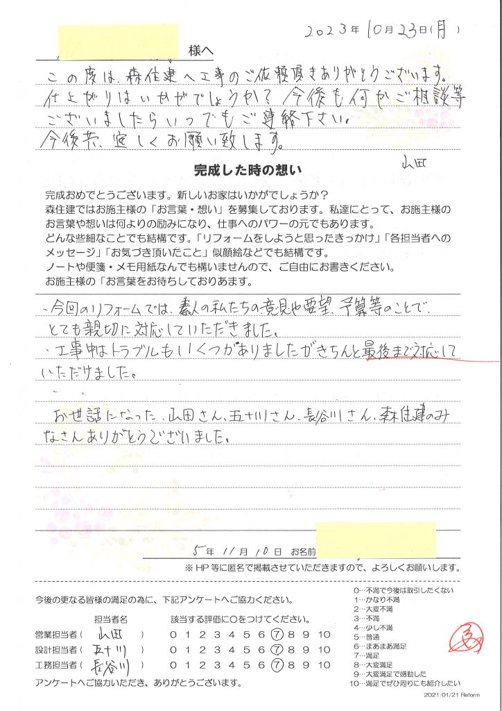 今回のリフォームでは、素人の私たちの意見や要望、予算等のことで、とても親切に対応していただきました。