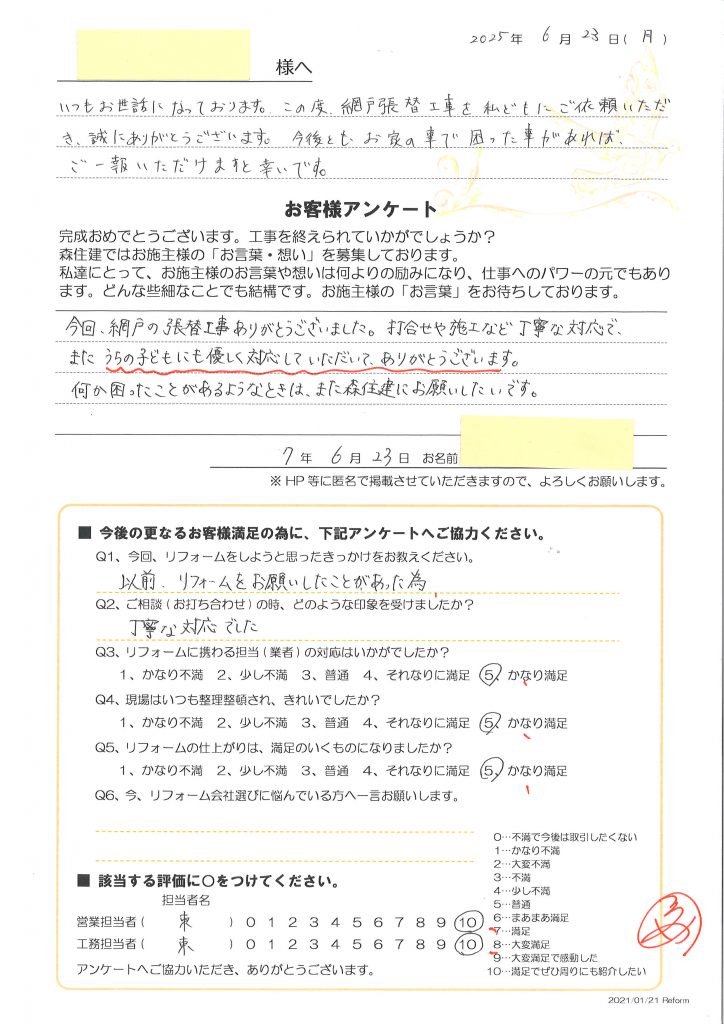 今回、網戸の張替工事ありがとうございました。