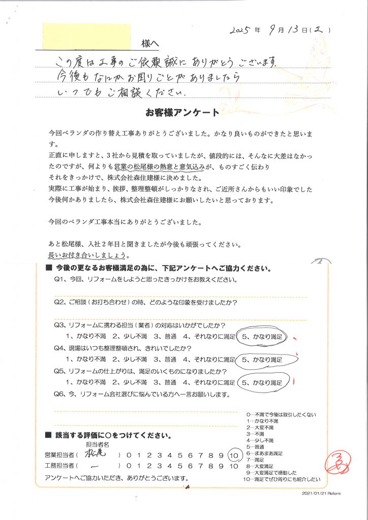 正直に申しますと、3社から見積を取っていましたが、値段的には、そんなに大差はなかったのですが、何よりも営業の松尾様の熱意と意気込みが、ものすごく伝わり、それをきっかけで、株式会社森住建様に決めました。