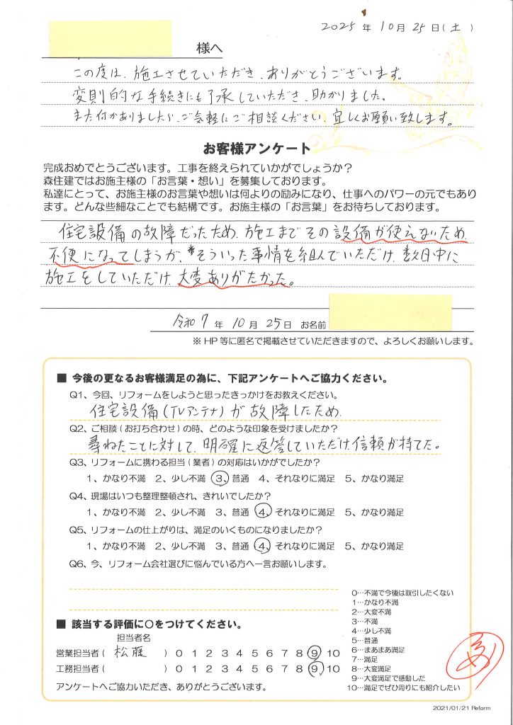 住宅設備の故障だったため、施工まで、その設備が使えないため不便になってしまうが、そういった事情を組んでいただけ、数日中に施工をしていただけ、大変ありがたかった。