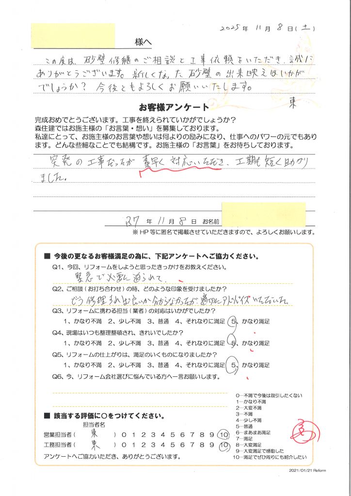 突発の工事だったが、素早く対応いただき、工期も短く助かりました。