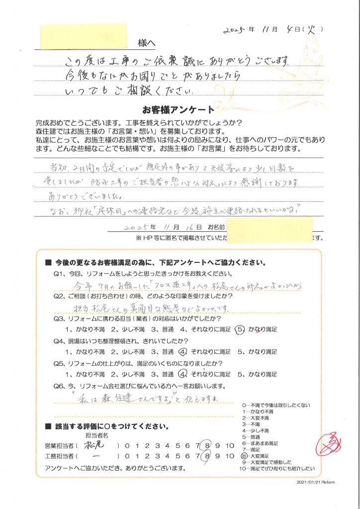 当初2日間の予定でしたが、想定外の事があり、又、天候等により少し日数を費やしましたが、防水工事のご担当者の熱心な対応により感謝しております。ありがとうございました。