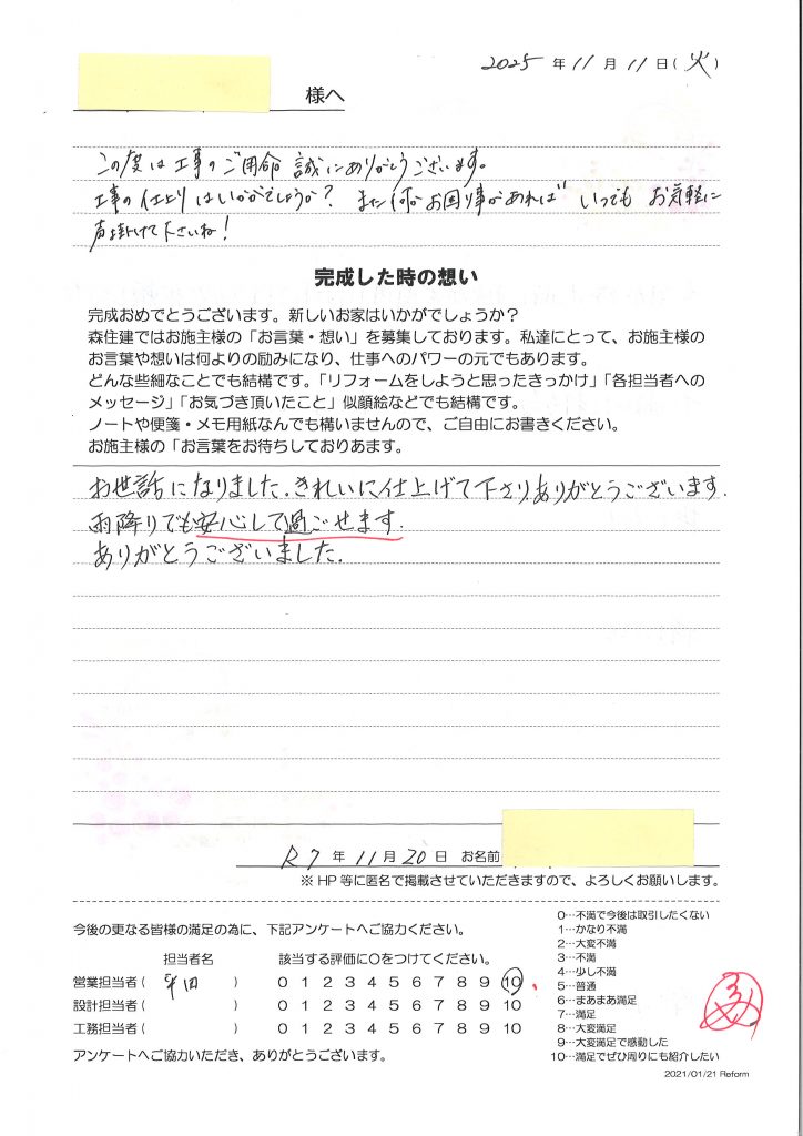 お世話になりました。きれいに仕上げて下さり、ありがとうございます。
