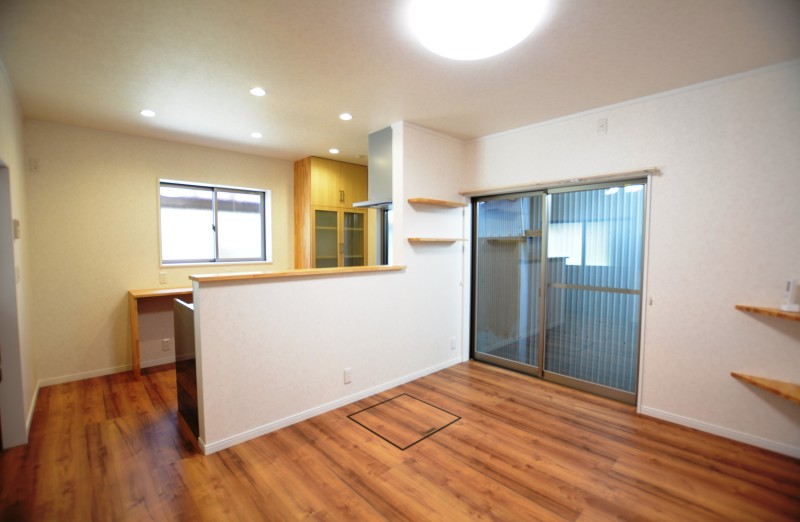 1階のDKスペースは約11畳のスペースで対面キッチンの実現と家族5人みんながTVを見ながら食卓を囲めるようTVの位置を変更し、壁掛けにすることをご提案しました。