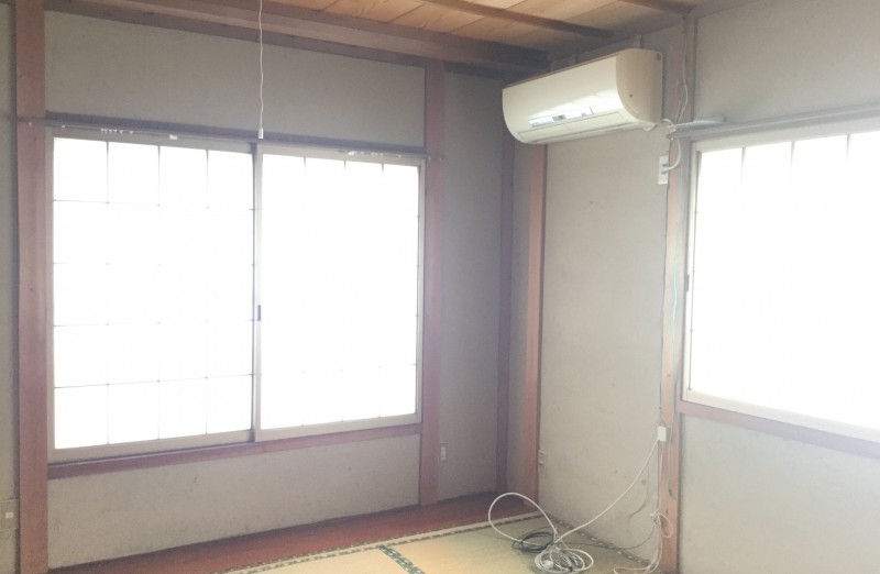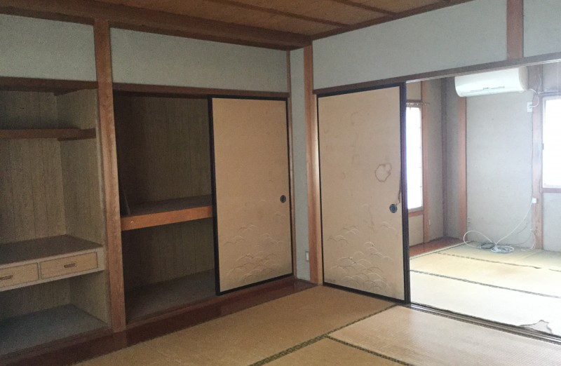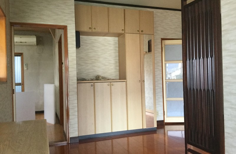 家族が出入りする勝手口のカギがなく、戸締りができないのに加え、2枚引き違い戸の両側に物があり、出入りが狭い。