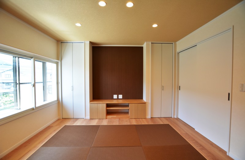 2階はご長男様の結婚後も見据えて間取りを変更し、ご夫婦でもたっぷり使えるWICや2階リビングを実現しました。少しは畳を残したいをいう想いから、リビングの中心に半畳の和紙畳を設置、そのままごろっとしても気持ち良く、また、色味をTVボード背面壁と合わせ、まとまった空間になりました。