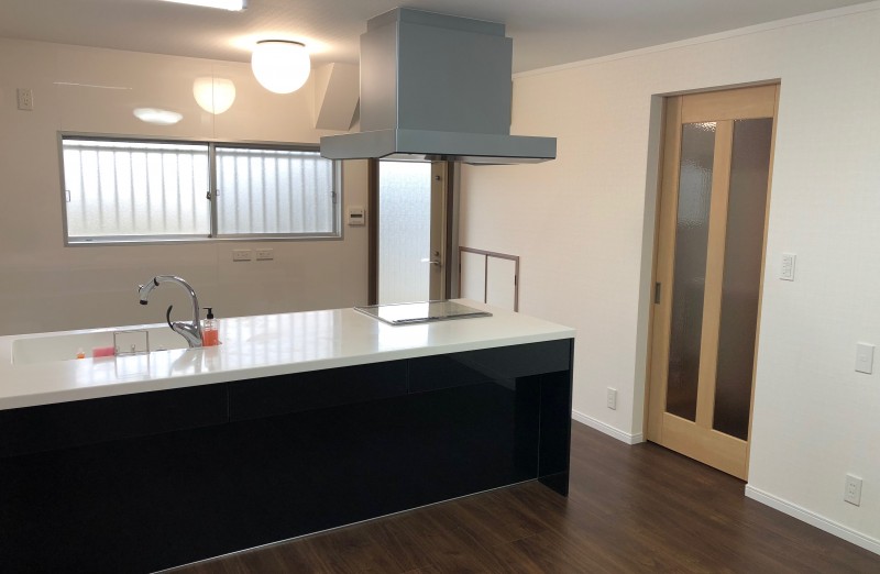 また、キッチンの入り口がドアだった為、対面キッチンを置くと狭くなってしまうので引戸に変えるご提案をさせて頂き、キッチンがきれいになるとリビングに入る引き違いの扉が浮いてしまうので、この引戸も変えさせていただくご提案をさせて頂きました。